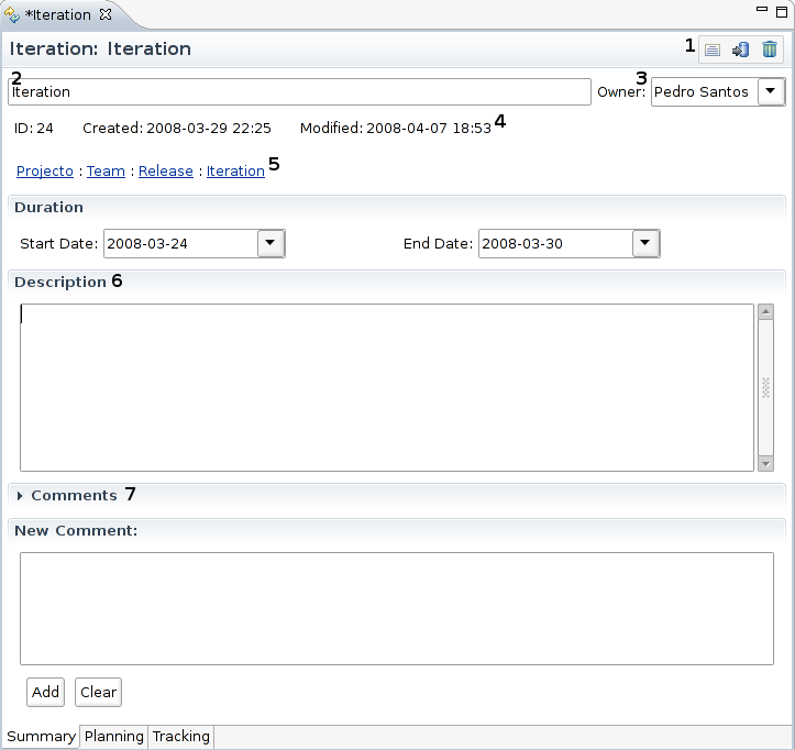 Além das vistas descritas, a ferramenta disponibiliza um editor para cada um dos principais elementos utilizados, nomeadamente: projectos, equipas, releases, iterações, histórias, e tarefas. Estes editores têm vários aspectos comuns que serão aqui descritos. A figura seguinte mostra um exemplo de editor de uma iteração.