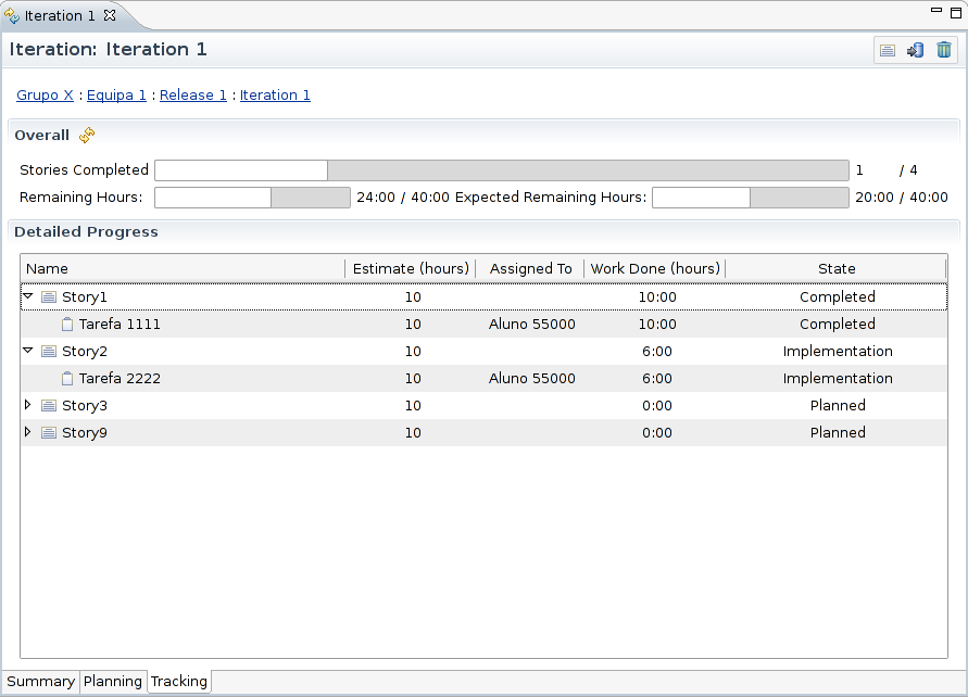 Na parte superior da vista estão os projectos e os seus sub-elementos até ao nível da iteração, na parte inferior estarão as histórias e tarefas associadas ao elemento seleccionado na parte superior.