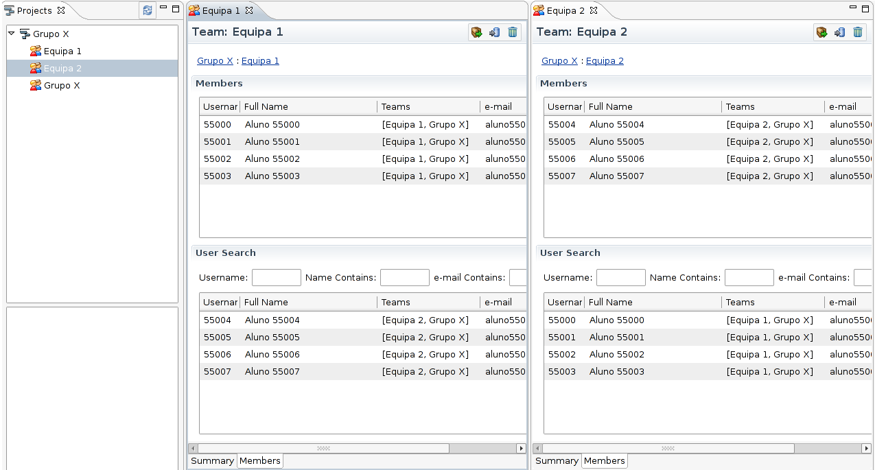 Por omissão, cada grupo terá já criados um projecto e uma equipa com todos os elementos do grupo. A ferramenta permite a criação de mais equipas e a redistribuição dos membros. Para criar uma nova equipa usar o menu de contexto: New > Team no projecto na vista 'Projects', ou usar a acção 'New Team' na toolbar do editor do projecto. Na criação da equipa deve apenas ser inserido o nome da mesma.