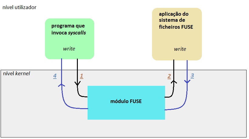 A figura que segue exemplifica o funcionamento do FUSE quando é executado uma chamada à função de sistema write.