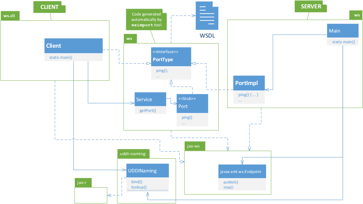 Para comunicar com servidores UDDI, existe a biblioteca JAX-R (Java API for XML Registries), que permite publicar, pesquisar e eliminar registos de Web Services.